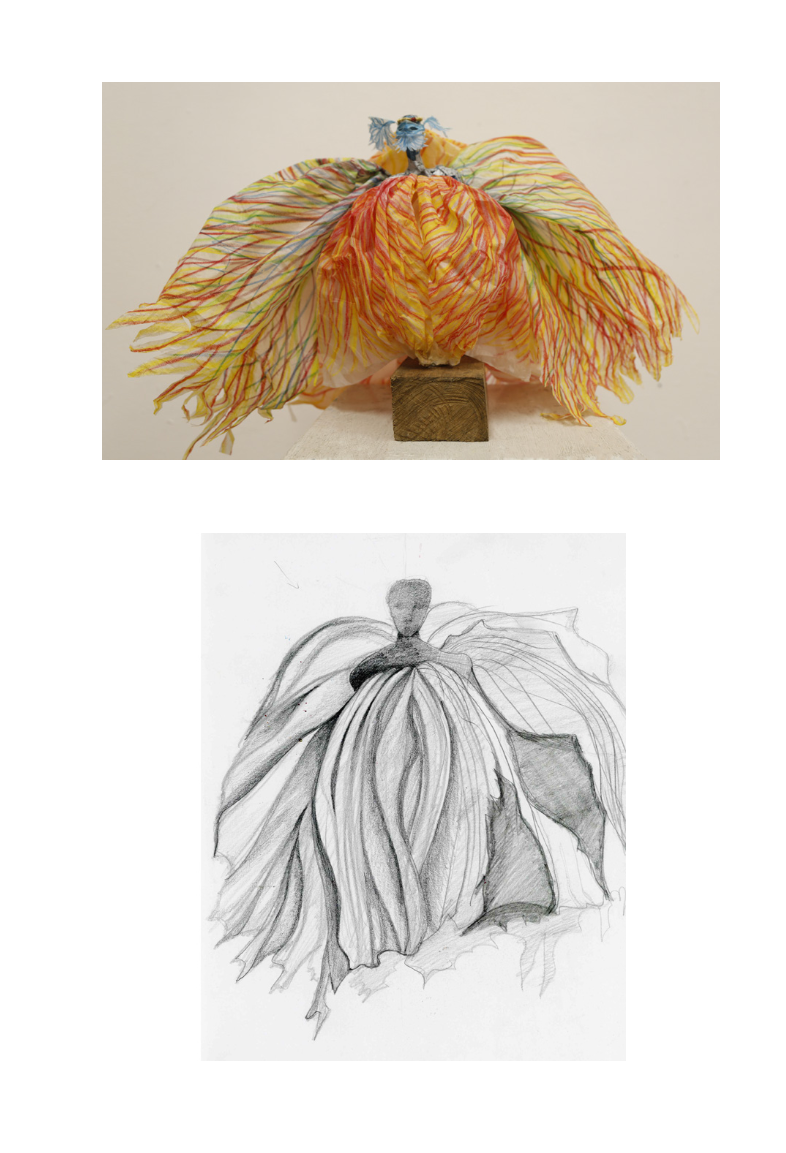 Croquis de recherche au crayon à papier sur Canson, maquette en papiers de soie, photo montage sur Photoshop.